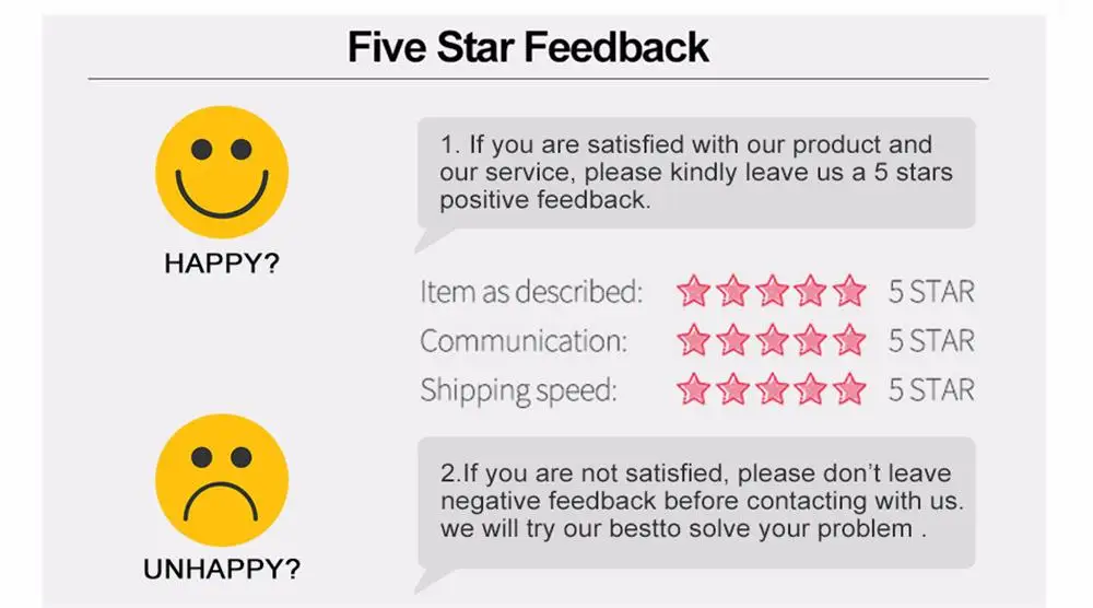 If you are satisfied with our products and services, please leave your positive feedback and 5 star, this will be greatest support for us;If you don't satisfied our porducts, pls contact us before you leave neutral (3 stars) or negative (1-2 stars) feedback.We guarantee we will 100% slove any problems for you.Please contact us before you leaving the negative feedback or opening any dispute on the site.Communication is the best way to solve the problems.